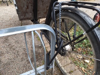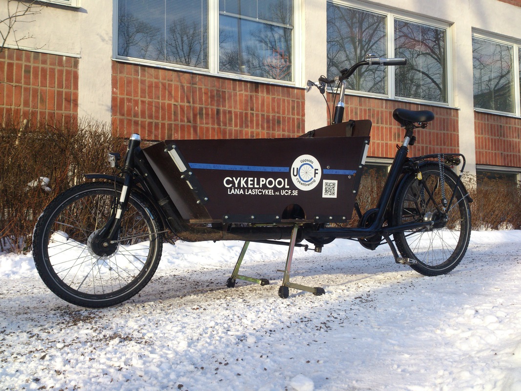 En praktisk och ändå relativt snabb och smidig tvåhjulig lastcykel. Med bälten för två barn, även bilbarnstol går att montera. Renoverad oktober 2018.